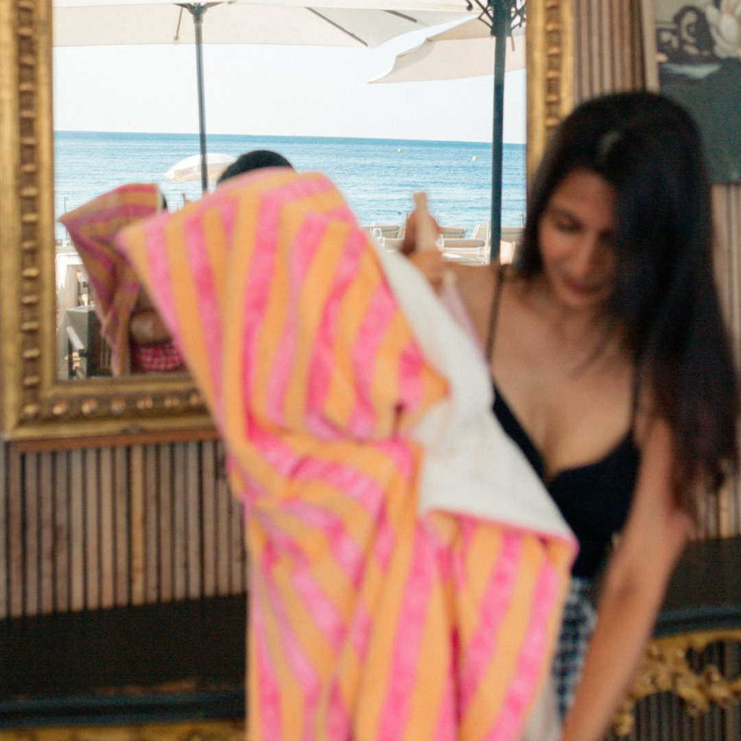 La cape de bain est cousue avec un tissu en éponge de bambou ultra douce dans les tons rose et melon.