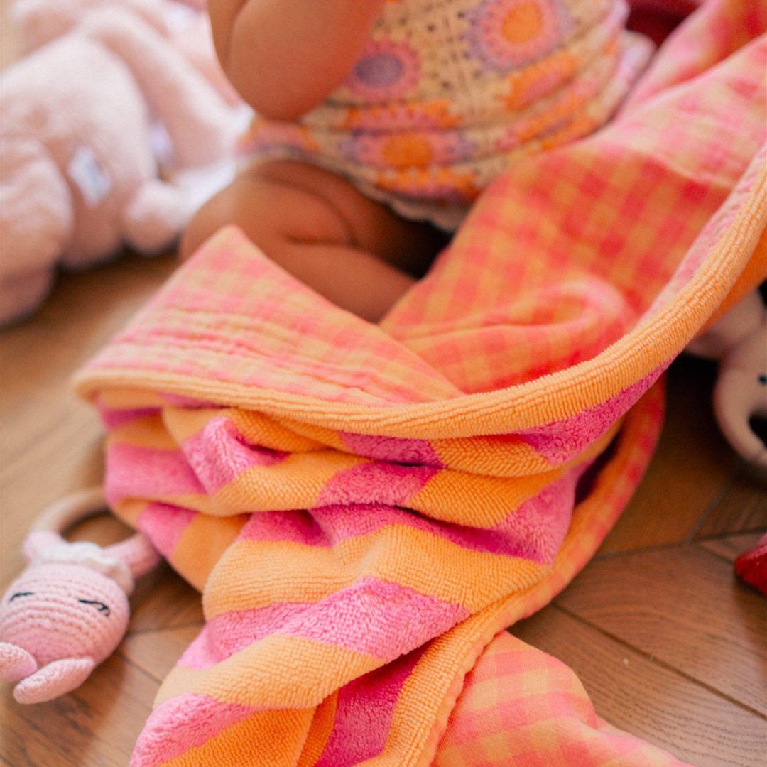 Découvrez notre couverture légère d’été, confectionnée et cousue main dans notre atelier en Provence avec avec de l'éponge de bambou ultra douce. Avec ses rayures dans les tons rose et melon, elle apporte une touche de peps et de folie. Idéale pour les soirées estivales, elle est facile à transporter partout. C'est l’accessoire parfait pour envelopper bébé de douceur.
