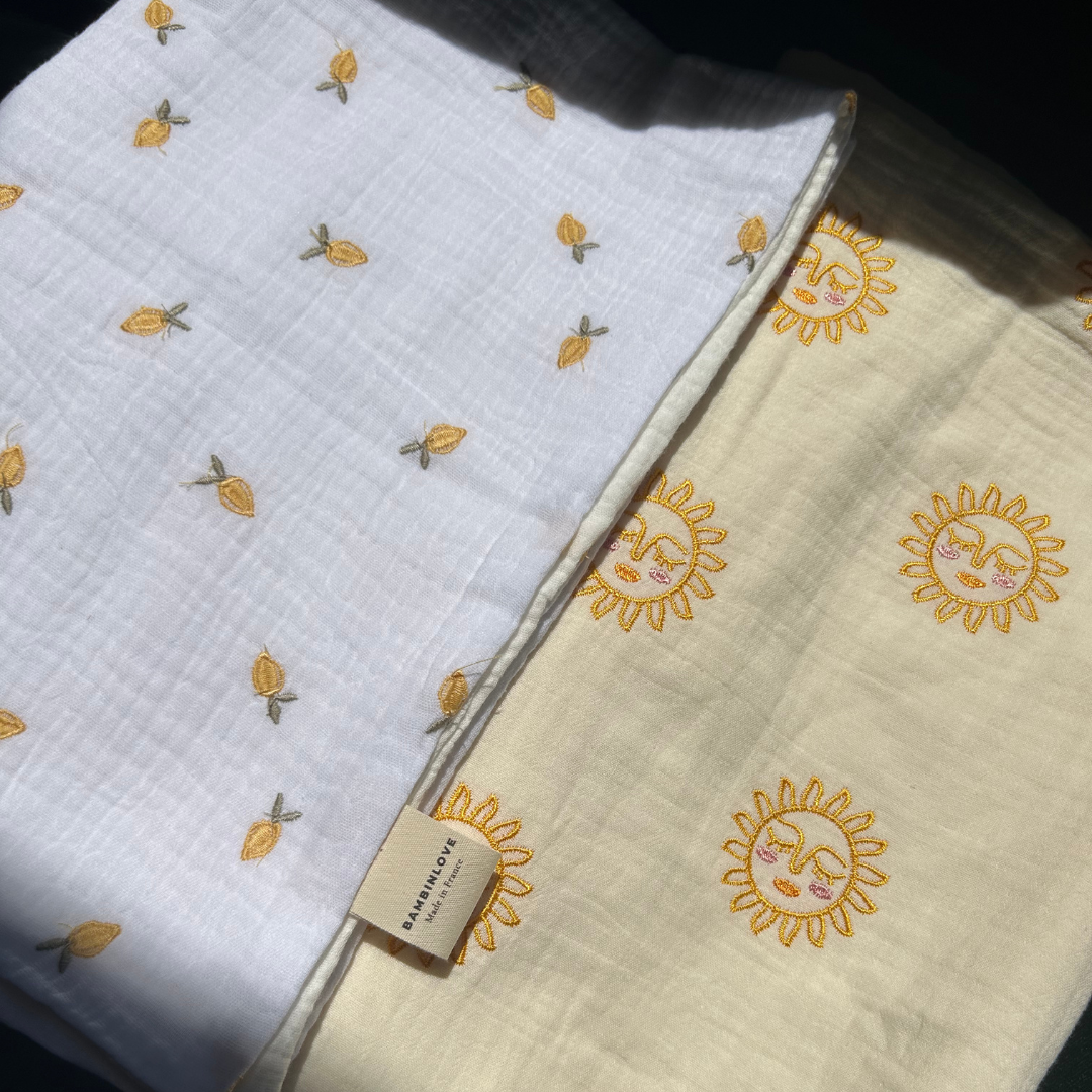 Ce duo est un cadeau de naissance idéal. Il réunit nos 2 collections brodées, soleil & citron
